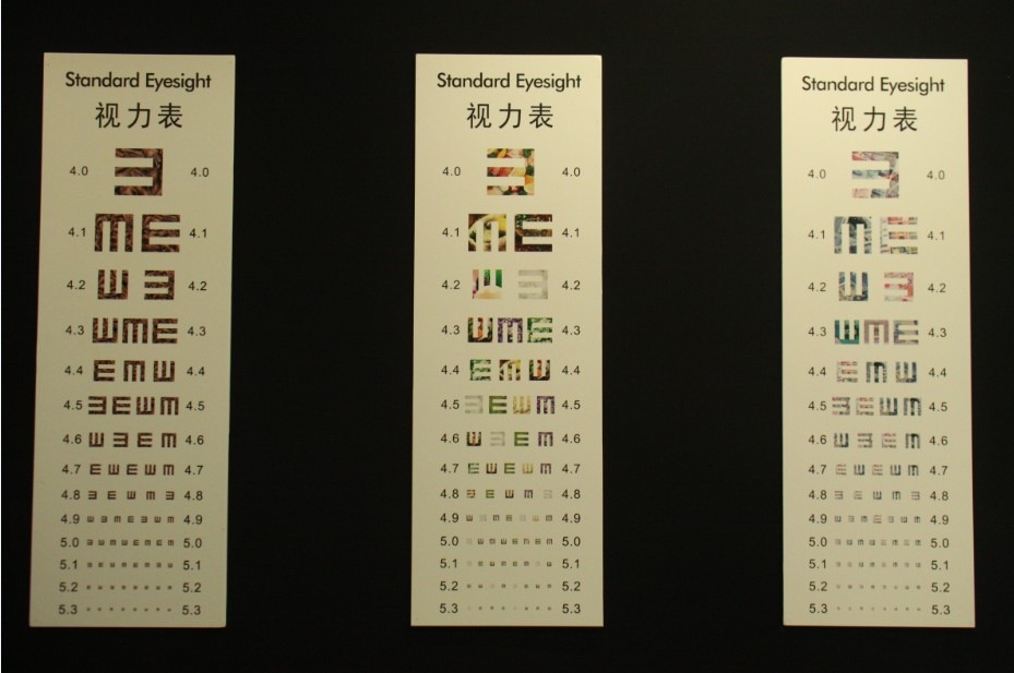 我在创作作品《视力表》时,也同样背负着这样的心理压力。作品强调的是物质世界中,人的欲望。生活中形形色色的材质代替不同类型的欲望,融入到视力表这个载体中。观众看到的不仅是视力表,更是“视利表”。一副视力表,121个E的符号,我需要选取上百种不同颜色不同质地的材质,纯手工贴在亚克力底板上。这不仅要考验我的耐性更要考验我的实际操作能力。