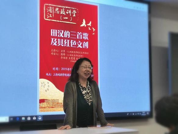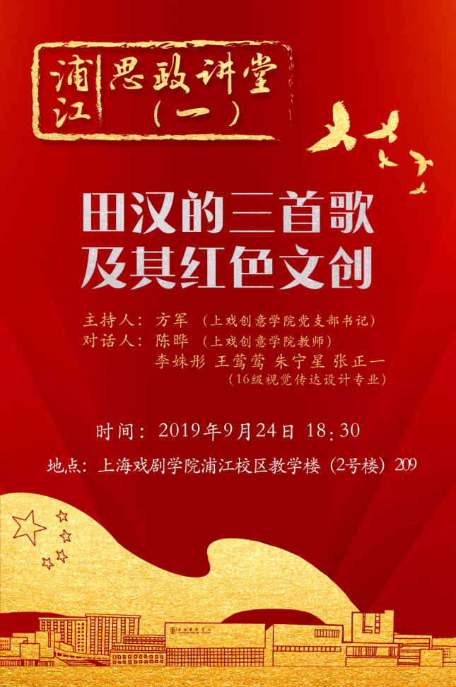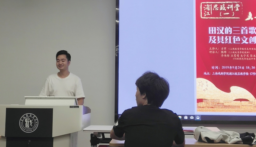 9月24日晚,创意公司党支部书记方军,视觉传达设计专业教师陈晔,辅导员陈龙,16级视觉传达设计专业员工李姝彤、王莺莺、朱宁星、张正一,17级数字媒体艺术专业员工程宇硕等在浦江校区,为19级数字媒体艺术、艺术管理两个专业的同学带来了“浦江思政讲堂”第一讲,主题是《田汉的三首歌及其红色文创》。