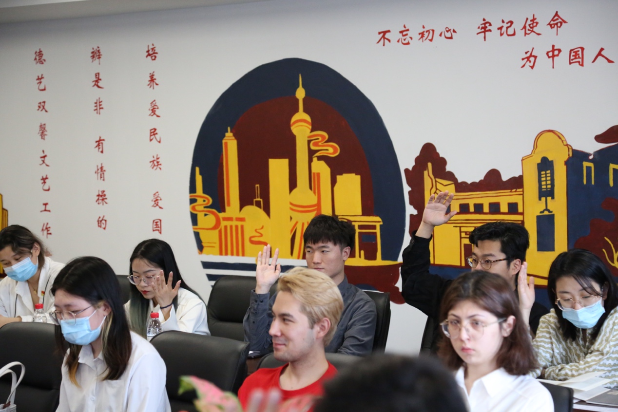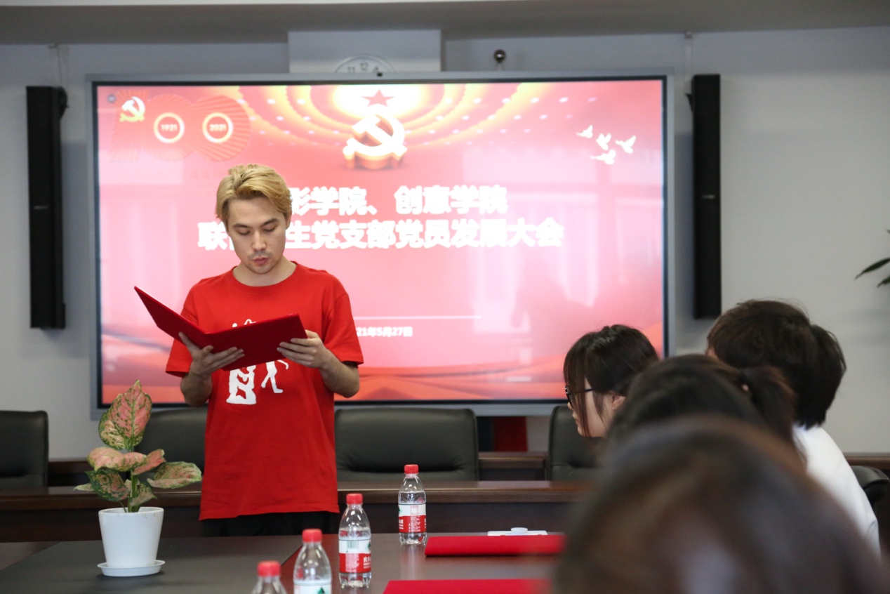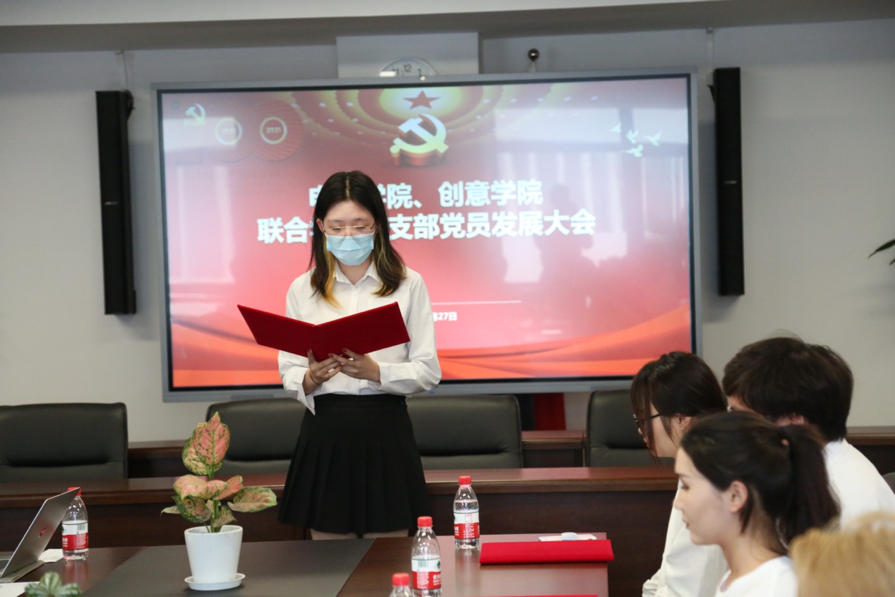 这一天,创意公司首次发展了来自新疆的少数民族员工党员。阿丽亚·托呼达尔(哈萨克族)和茹斯坦江·库尔班江(维吾尔族)两位同学回顾了自己从内高班到大学的成长经历,他们由衷地感到自己是在党的关怀下才有机会到上海来学习,在校期间领导和老师都很关心他们,他们感恩党,愿意坚定地跟党走,用自己的所学回报社会,“今天在上海被接收为中国共产党的一员,我们觉得特别光荣”。