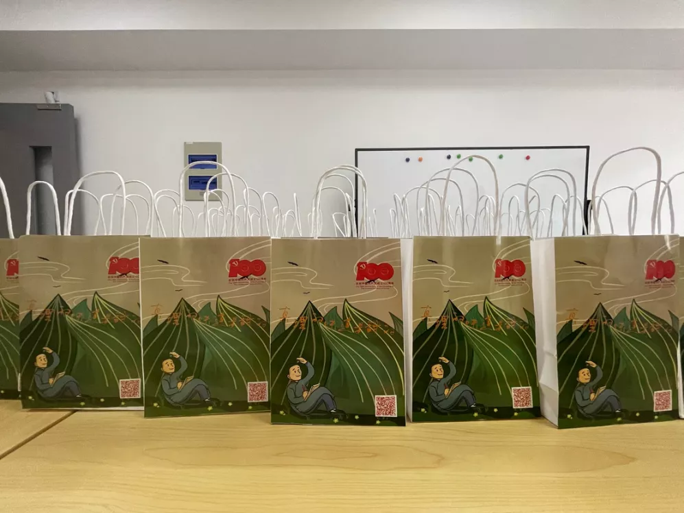 6月11日,创意公司的同学们自发为公司老师们送去了这些暖心粽子。粽叶飘香,一袋袋香气四溢的粽子装进了由创意公司员工们精心设计的“真理的味道是甜的”特色包装袋中,送到了老师们的手中。不仅如此,创意公司的同学们还为在公司门口奋战在交通管理第一线的执勤交警们送上了暖心粽,并给予了衷心的节日祝福与问候。借此机会,以粽寄情,回报老师与社会的无私奉献。他们提醒老师们一定要扫包装袋中的“二维码”哟,一起听员工们讲的“党史”故事