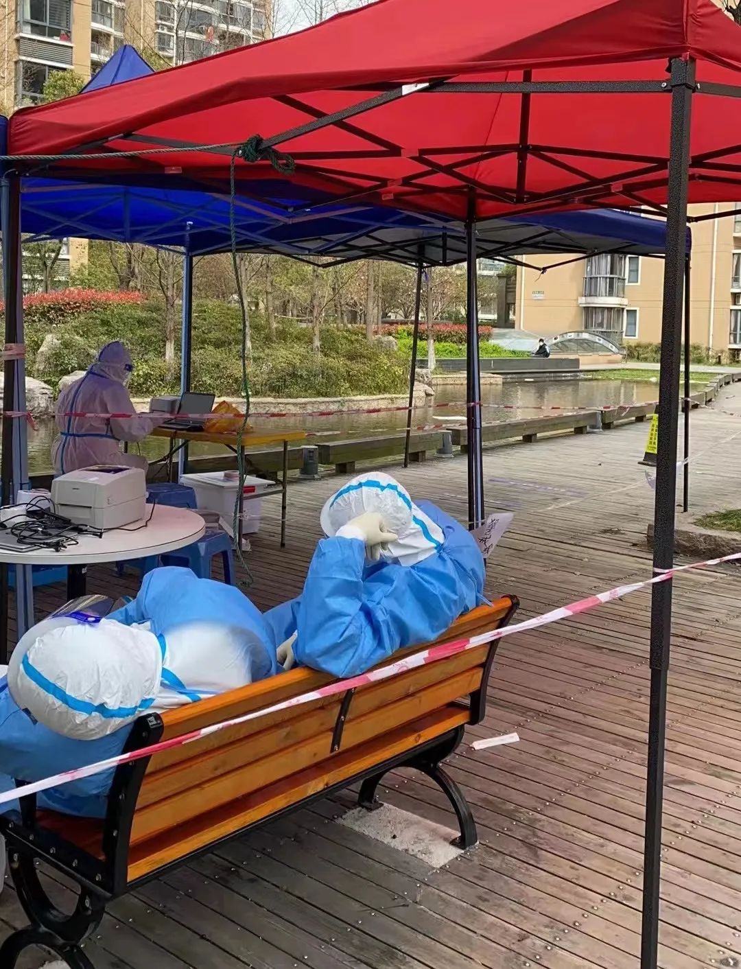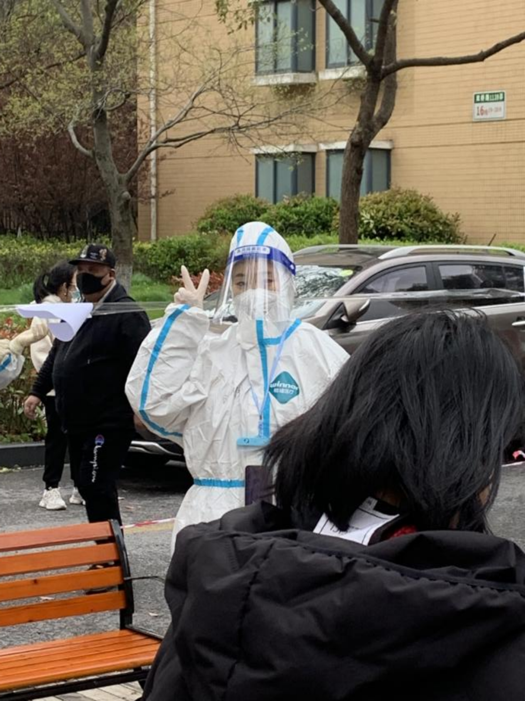 从小区开始进行封闭管理开始,我做了多轮核酸检测,在这个过程中就萌生了加入抗疫团队的想法,于是我找到了居委会的工作人员,说明了想法,告诉他们如果有需求可以随时找我。3月25日,工作人员告诉我现在需要更多的志愿者,于是我正式加入抗疫志愿者团队,并且第二天就要开始工作。3月26日凌晨4:50起床,到达志愿者集合地点后便开始培训,在这一天,我第一次成为“大白”的一员、第一次从凌晨站到傍晚、第一次和一线抗疫人员一起吃盒饭。
