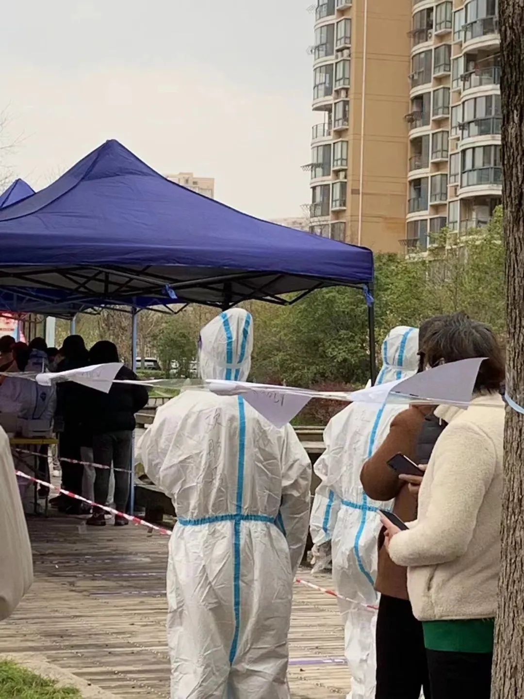 我负责的工作是居民引导、帮助老人进行健康云登记等,总之是哪里需要我就到哪里去,从早上布置检测现场开始,到整轮检测结束,从1号楼到32号楼,在这里,我第一次见到整个小区的居民——从婴儿到老人。在这里,可以看见居民为老年人让出的快捷通道,可以听见稚嫩的孩子和父母讨论冰箱里是不是还有油炸大虾,有小员工带着疑惑的口吻念着我背后的名字,当然,还有我们亲爱的“大白”耐心的指导与安慰。一整天下来,等待的队伍都安静且有序,我看到的是希望而不是悲伤。这次平凡又特别的经历既让我惊讶,也真真切切的令我感动。