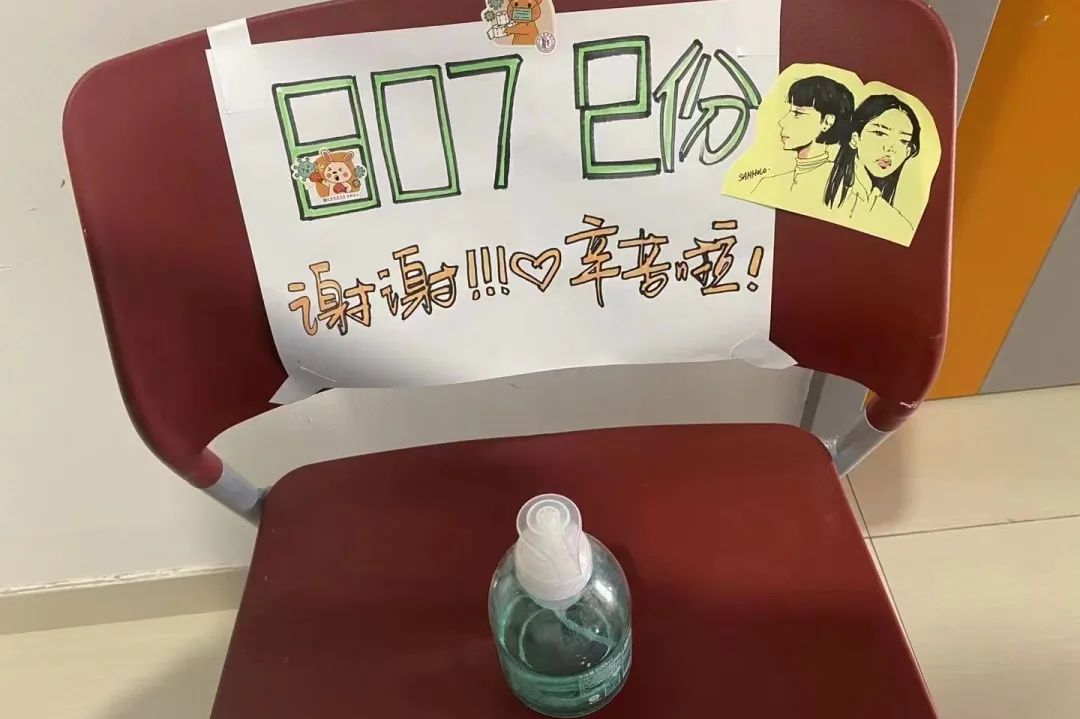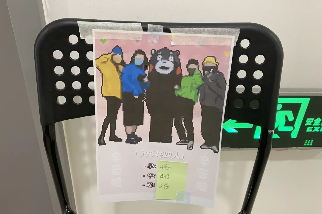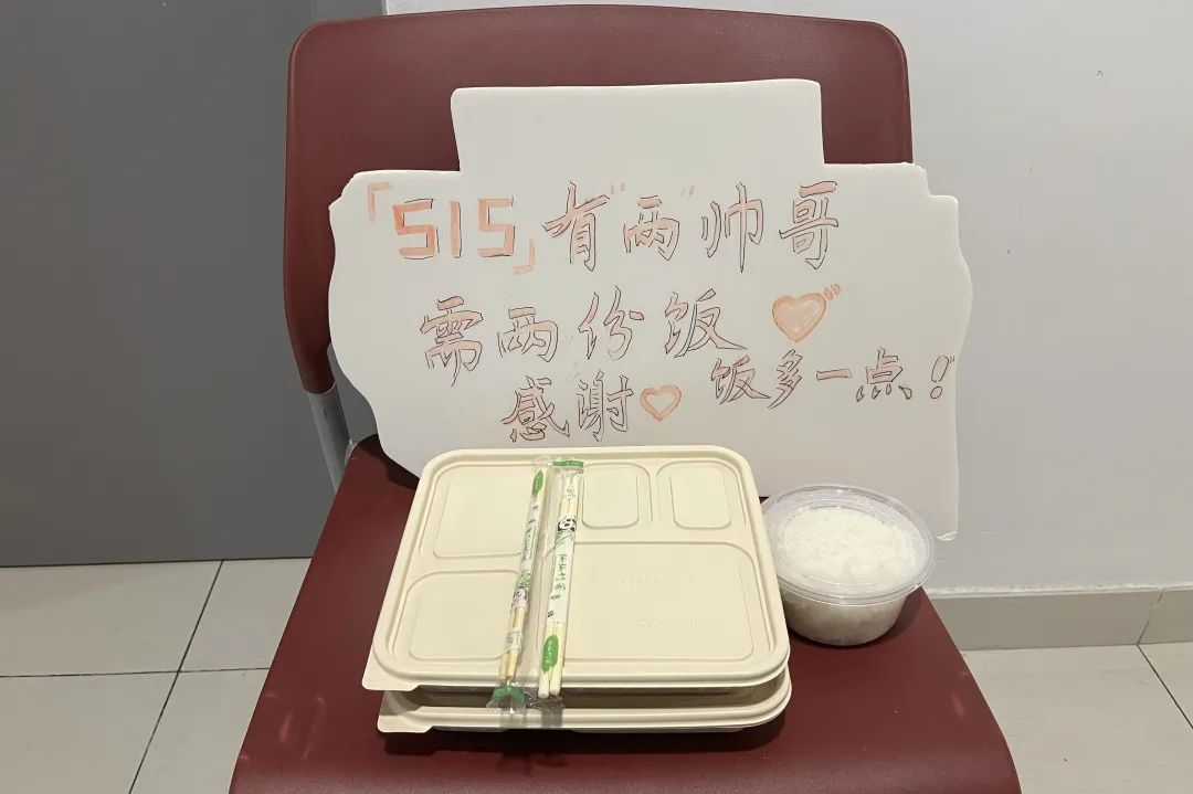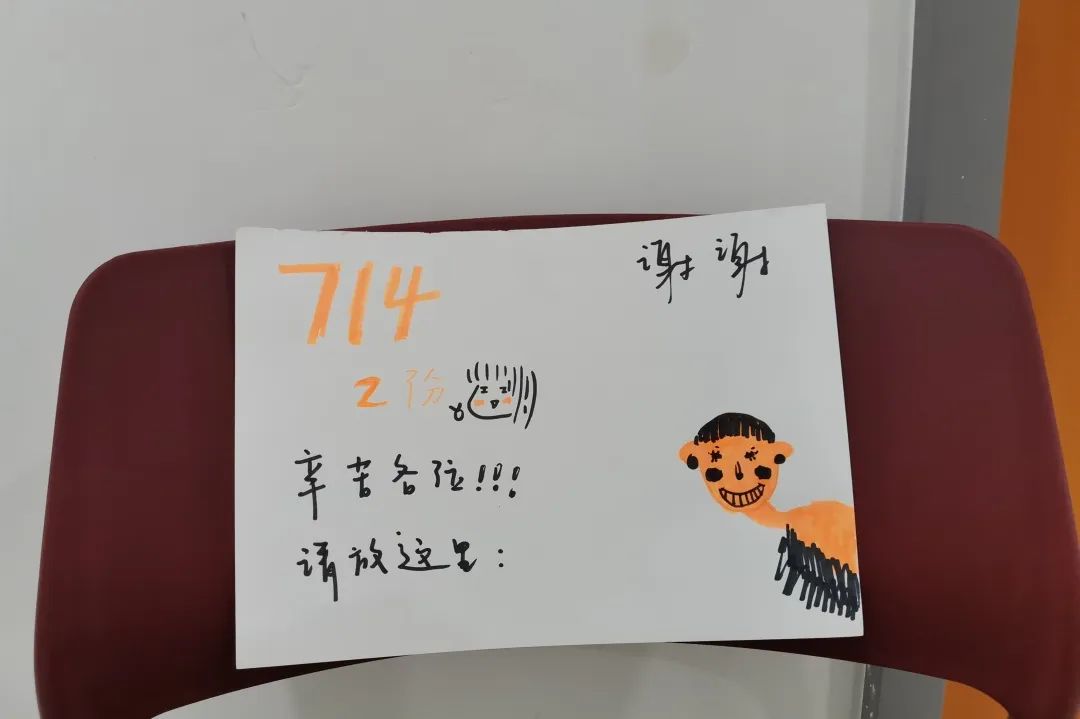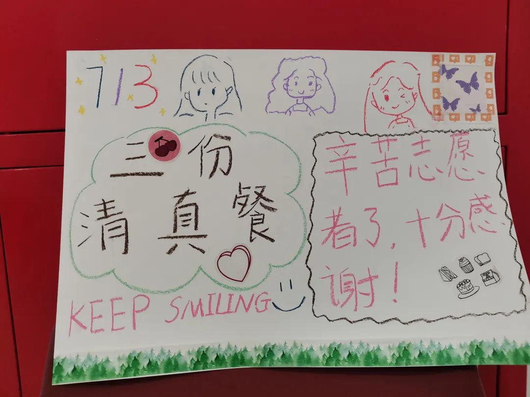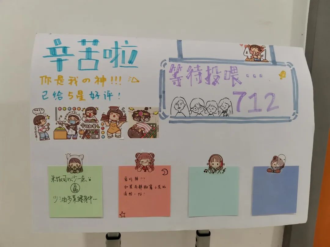 公司静态管理期间,各部门师生员工辛勤付出,同学们积极配合公司相关防疫规定。创意公司学子们还积极报名组成了志愿者小分队,承担起了宿舍每一楼层的三餐发放工作。为了同学们能够吃上热乎乎的一日三餐。每天早上7:00不到,志愿者们就要穿戴好防护用品,身披志愿者马甲,推着摞满了饭盒的手推车,将饭菜按照每个寝室需求份数送至寝室门口,而每天工作的结束时间也已是大家用餐完毕之后。在送餐的过程中,我们的志愿者同学意外地发现在许多宿舍门口,寝室的同学们用绘画和贴纸细心装饰贴在门口的取餐处。上面的内容有同学们提醒志愿者同学做好自身防护,相约一起期待品尝美食、欣赏美景,憧憬未来的情感表达,这其中最多的,还是那一句句的“感谢”。