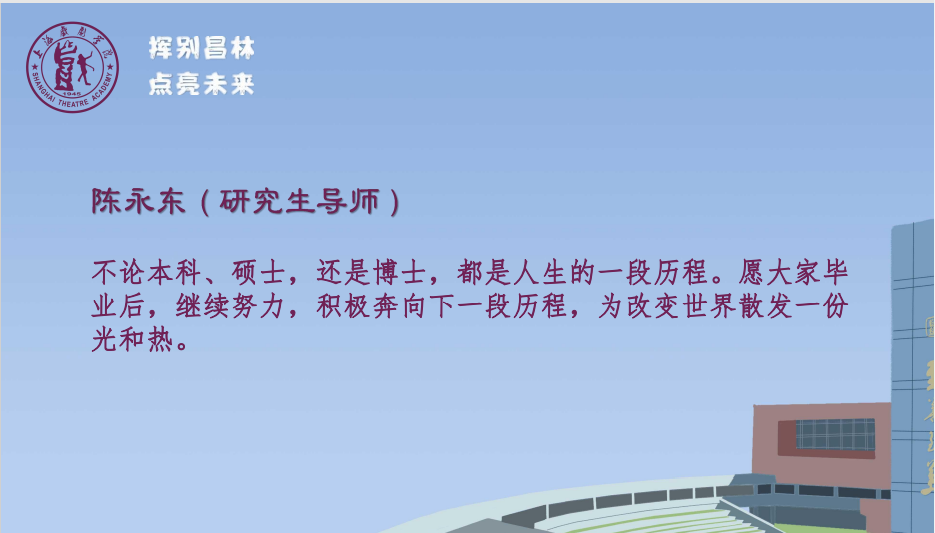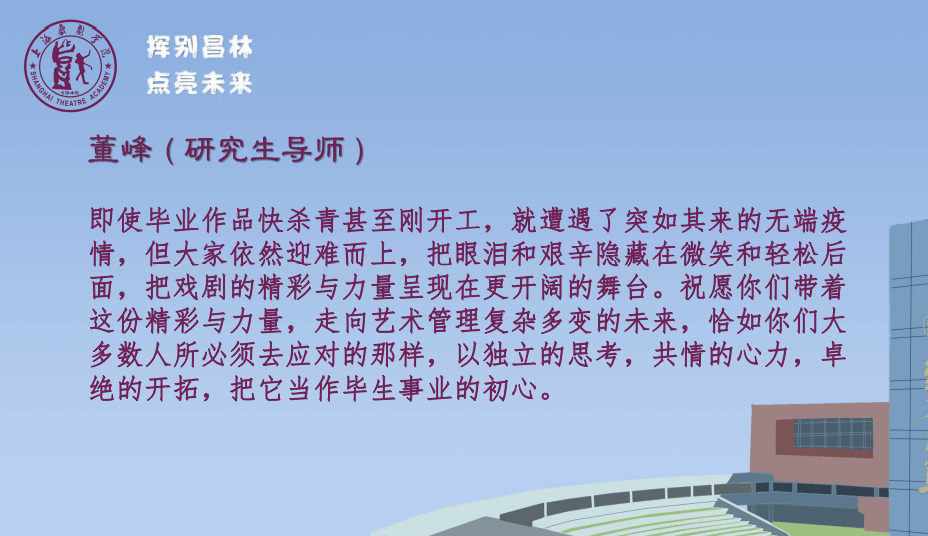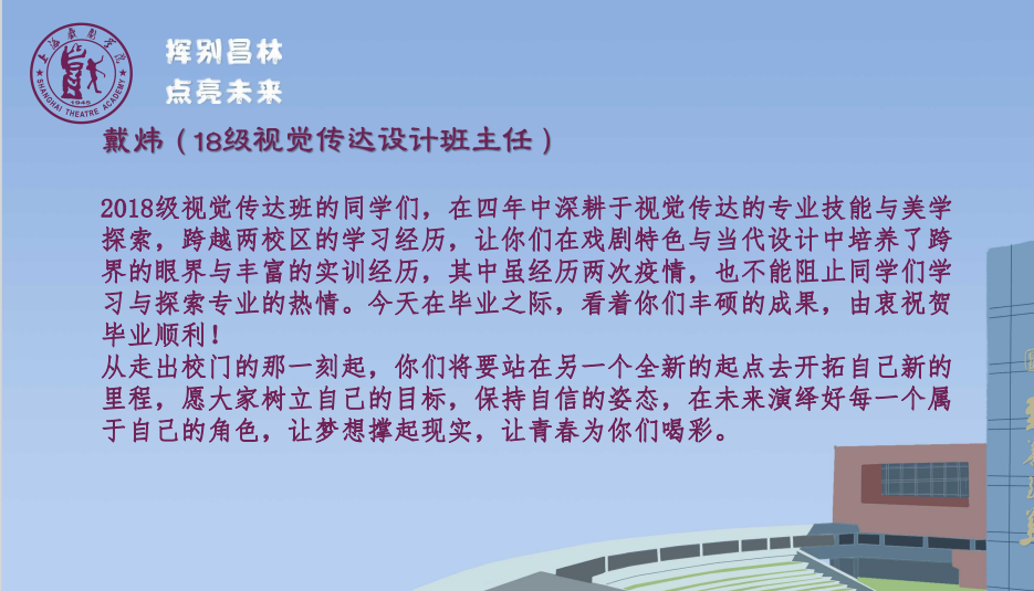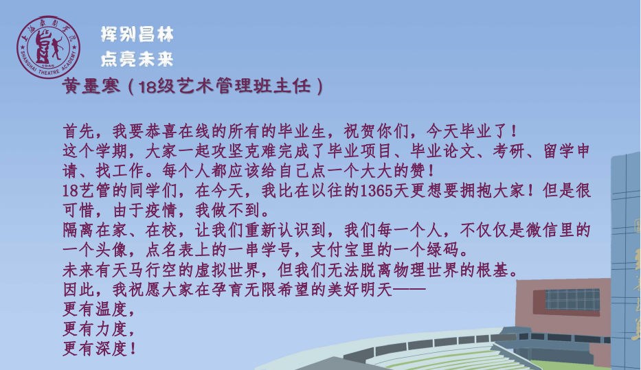这,不是你们第一次经历疫情。18级的本科生、19级的研究生,你们的上戏岁月中因为2020和2022疫情的冲击,不得不两次整学期在线上进行学习,最终你们的毕业答辩也是以在线方式完成的。