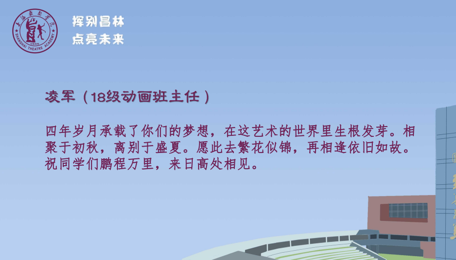 在第三篇章“寄语未来”中,18级艺术管理班主任黄墨寒,18级视觉传达设计班主任戴炜,18级动画班主任凌军,20级艺术管理第二学位班主任包立峰,研究生导师代表董峰、陈永东,分别为毕业生们送上了情真意切的寄语。