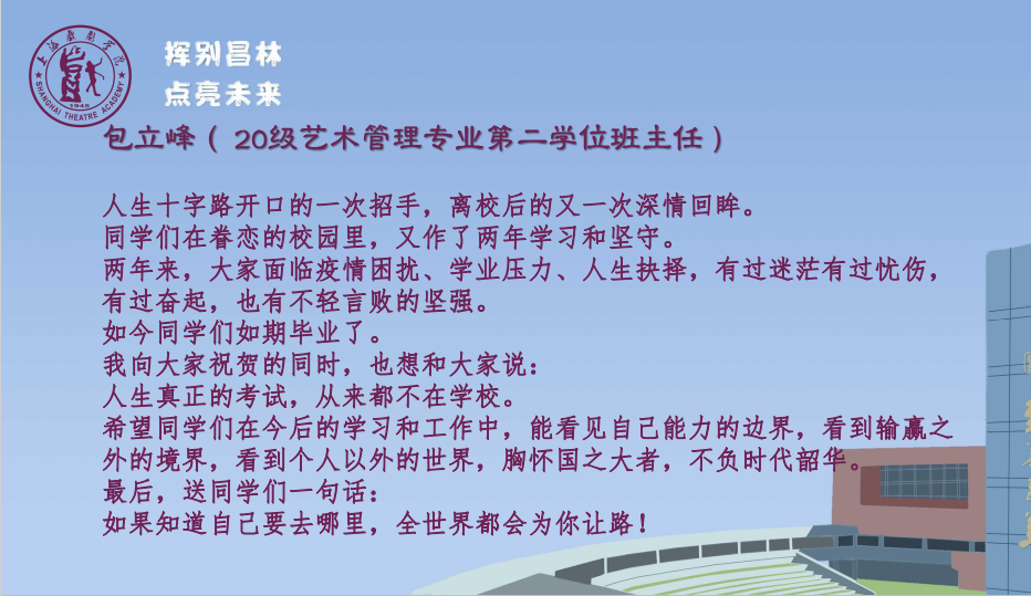 聚是一团火,散是满天星。告别昌林,请带着“求精求实、至善至美”的理想勇敢地前行,扎根中国大地进行艺术的创作、实践与研究,将自己的人生梦想融入实现中华民族伟大复兴的不懈奋斗中。