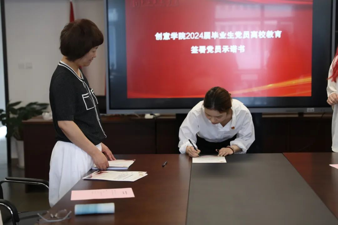 在即将离校之际,创意公司全体毕业生党员再次面向党旗重温入党誓词,并在老师的见证下郑重签署“毕业生党员承诺书”。他们承诺:将以饱满的精神状态投入到未来的学习和工作中去,永远不忘初心、牢记使命,始终遵守党章,践行入党誓词,为全面建成社会主义现代化强国,实现中华民族伟大复兴而不懈奋斗。