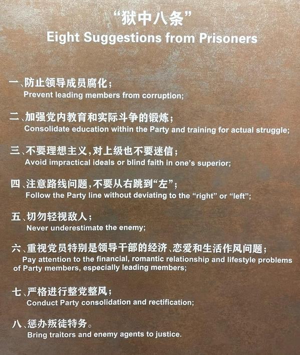 党纪学习教育特别展《忠诚与背叛——“狱中八条”的由来及历史警示》,取材于重庆解放前夕,牺牲在歌乐山白公馆、渣滓洞的英烈们以对党的忠诚所总结的“狱中八条”。