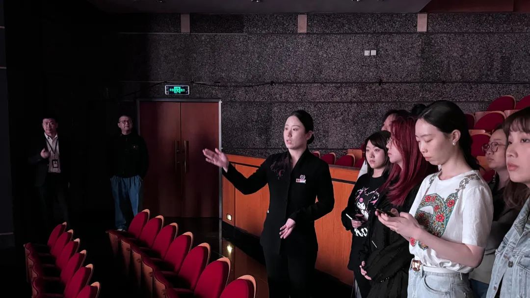 课程伊始,同学们参观了大剧场。大剧场共有1800个座位,分为三层看台,设计精巧,每个细节都体现了对观众体验的极致追求。比如,大剧场的木板和隔板并非平面,而是精心雕刻了花纹,这些设计不仅美观,更能够通过反射声音,为观众营造出更加完美的听音环境。