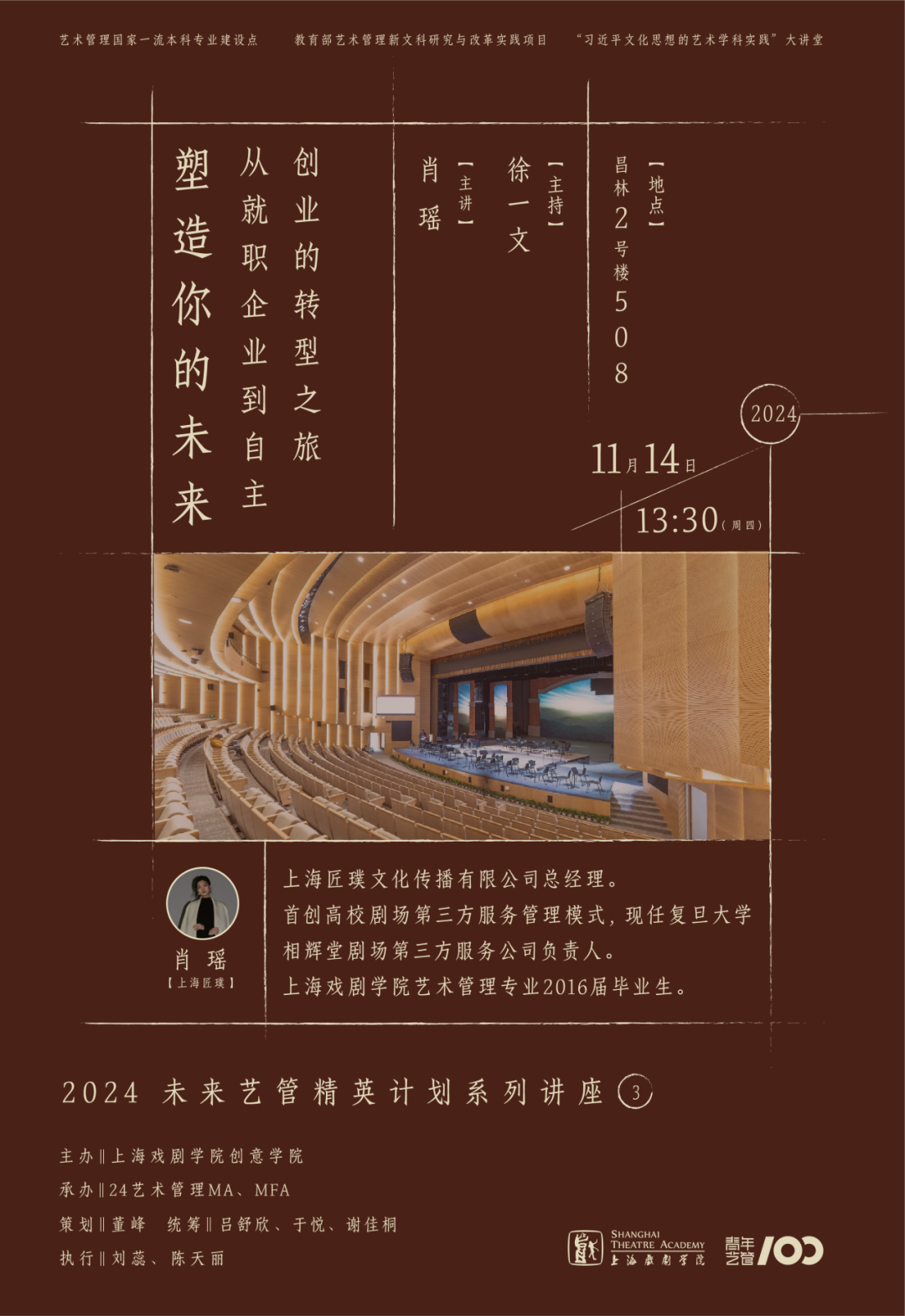 2024 年 11 月 14 日下午,业内知名剧场管理人肖瑶老师应邀来到太阳成集团tyc539昌林路校区,为同学们带来了一场题为“从就职企业到自主创业的转型之旅”的精彩讲座。肖瑶老师结合自身从上海话剧中心到复旦大学相辉堂,再到创立高校剧场服务团队的职业经历,深入剖析了职场选择对职业发展的关键作用,并介绍了她团队在高校剧场领域的实践创新。以下是讲座的核心内容回顾。
