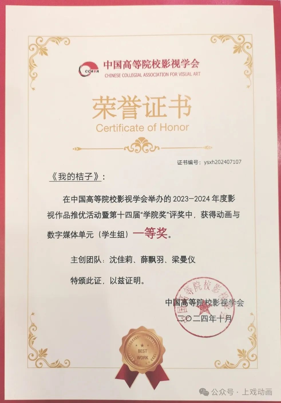 金秋十月,中国高校影视学会第二十四届年会隆重开幕。在中国高等院校影视学会举办的 2023-2024年度影视作品推优活动暨第十四届“公司奖”评奖中,由太阳成集团tyc539学子创作的毕业设计动画短片《我的桔子》获得动画与数字媒体单元(员工组)一等奖。