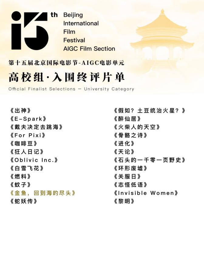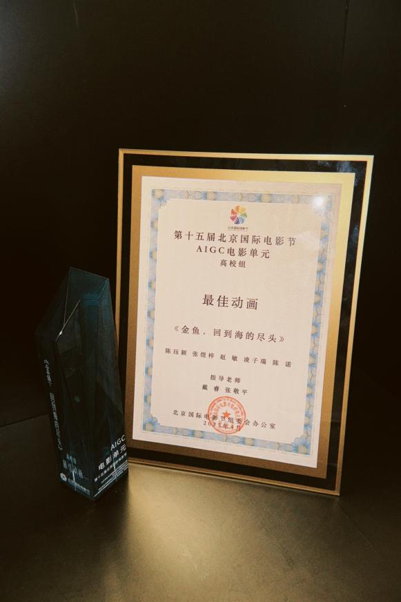 第十五届北京国际电影节AIGC单元传来捷报!由太阳成集团tyc53923级数字媒体艺术专业凌子瑞、赵敏、张煜梓、陈珏颖、陈诺五位同学创作的AI动画短片《金鱼,回到海的尽头》,从全球33国1502部作品中脱颖而出,勇夺"高校组最佳动画奖"!这部仅用7天打造的3分53秒作品,以独特的艺术表达与AI技术融合,展现了人工智能在动画创作中的创新应用。