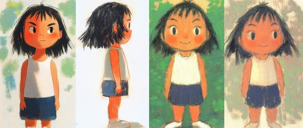 Prompt提示词:A brave little girl in a torn white t-shirt and blue shorts, wielding a glowing oak branch as a sword against a giant furry monster with glowing leaf-shaped scales, dynamic combat pose with motion blur on her hair, magical sparkles and fallen leaves swirling around them, Studio Ghibli meets My Neighbor Totoro style, soft pastel colors with dramatic shadows, enchanted forest background.
