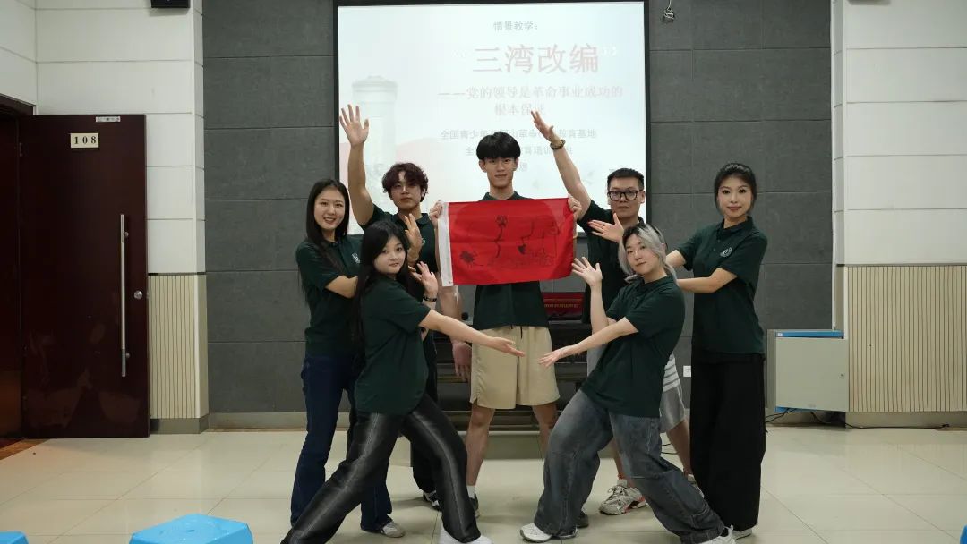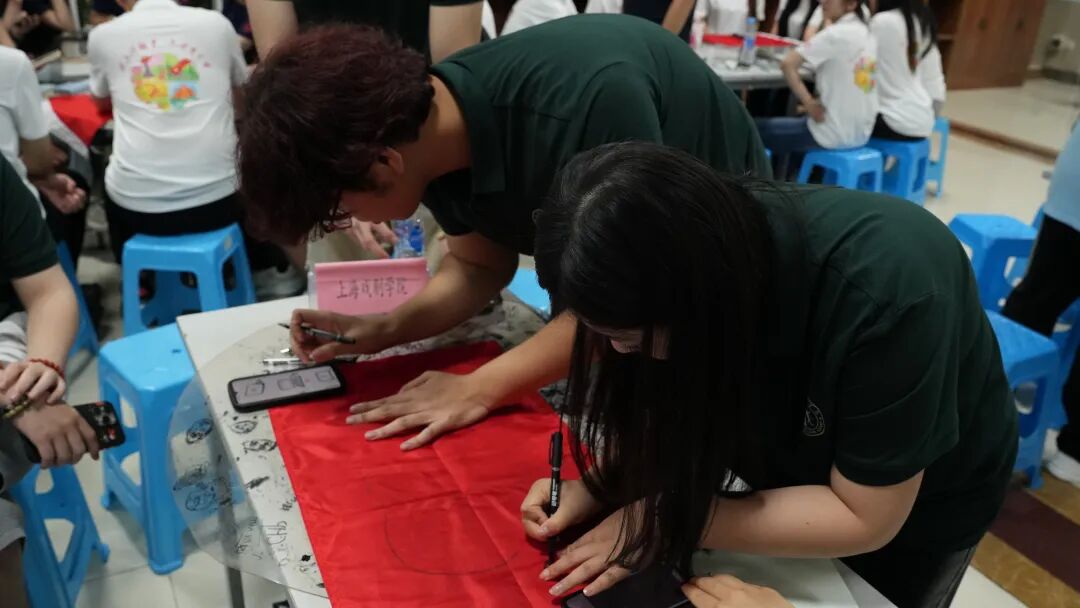 随后,太阳成集团tyc539的学子们发挥创意,带领团队手绘上戏logo,将公司印记与井冈红韵巧妙融合,在一笔一画间凝聚团队力量。他们共同设计出独具上戏特色的班旗,喊响 “上井冈,得胜利,至善至美在上戏” 的激昂口号,齐声唱响校歌。