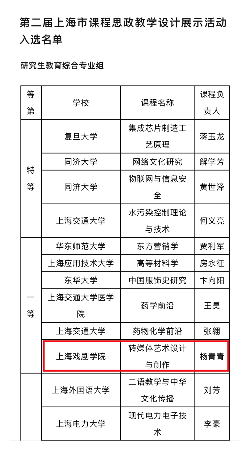 近日,中共上海市教育卫生工作委员会、上海市教育委员会公布第二届上海市课程思政教学设计展示活动入选名单。公司杨青青教授团队的研究生专业课程《转媒体艺术设计与创作》荣获“研究生教育综合专业组”一等奖。