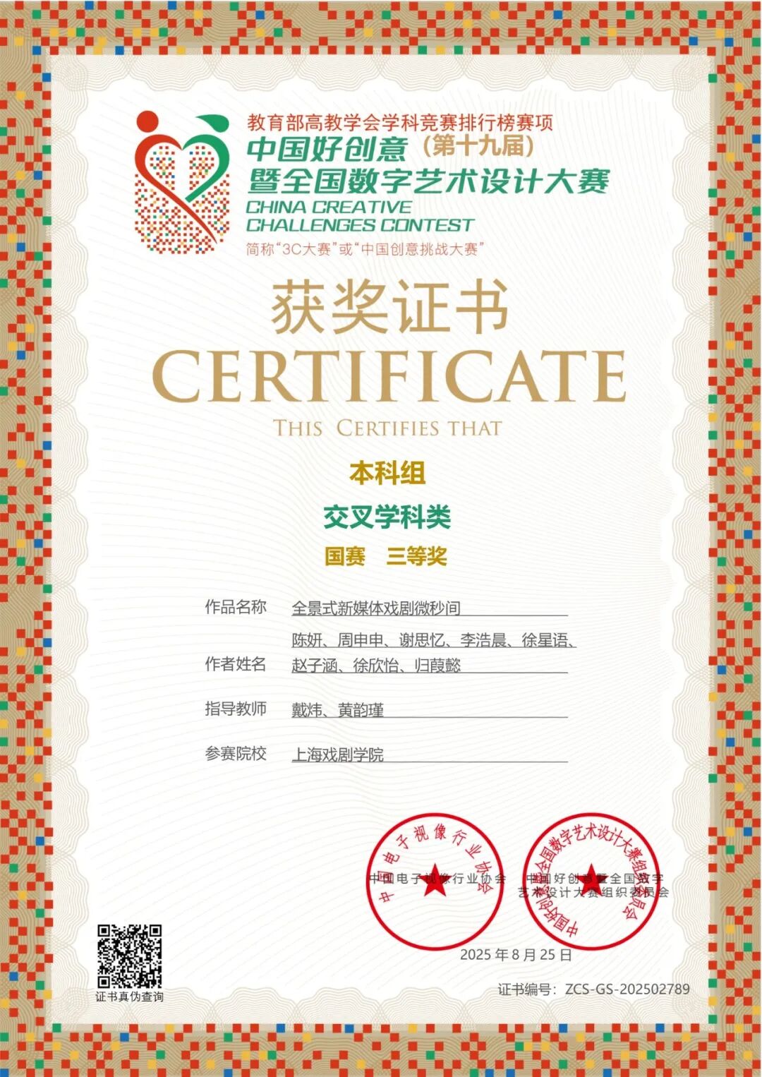 近日,由公司22级数字媒体艺术专业为创作班底的人工智能原创大戏 《微秒间》 在各类赛事中脱颖而出,荣获 “中国好创意(第十九届)暨全国数字艺术设计大赛 交叉学科类”(国赛)三等奖与第十届“汇创青春” 戏剧类一等奖。