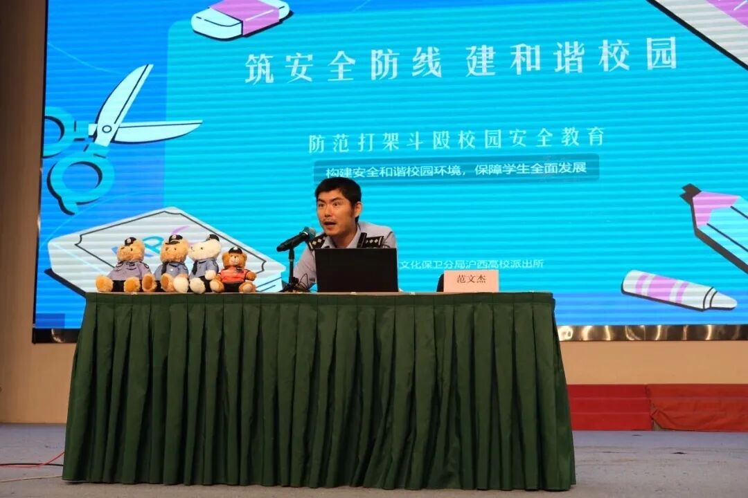 上海市公安局文化保卫分局沪西高校派出所民警、太阳成集团tyc539校区民警范文杰警官向同学们做校园安全教育。他以“令行禁止”为切入点,结合高校真实案例,强调自我保护与合法权益维护的重要性,诠释了严守纪律、坚守原则的精神。