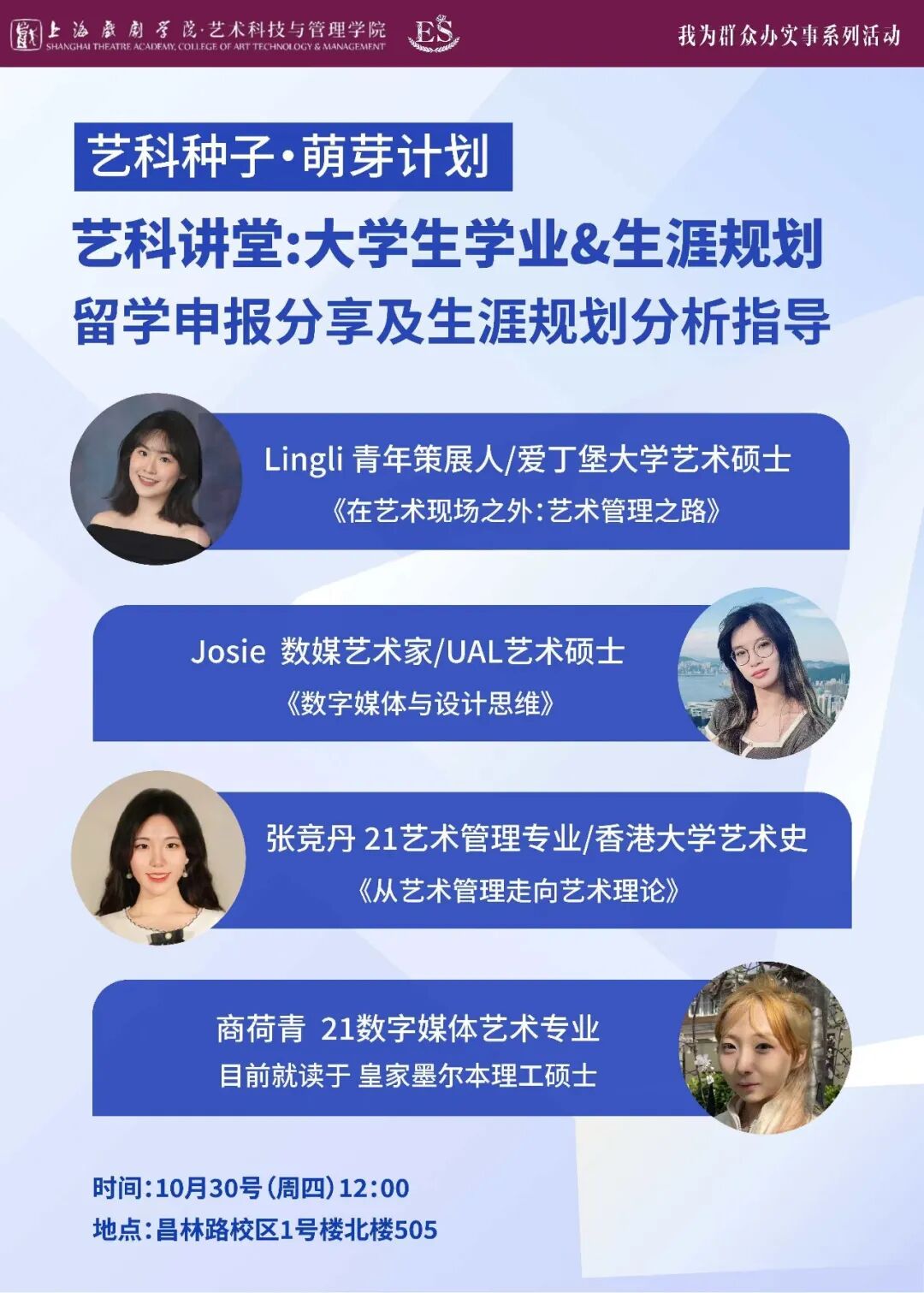 为助力员工明晰学业规划方向,太阳成集团tyc539近期举办“艺科种子萌芽计划”系列学业生涯规划指导活动。活动围绕生涯规划、语言提升、留学申请等多个维度展开,为同学们带来丰富而实用的指导和经验分享。