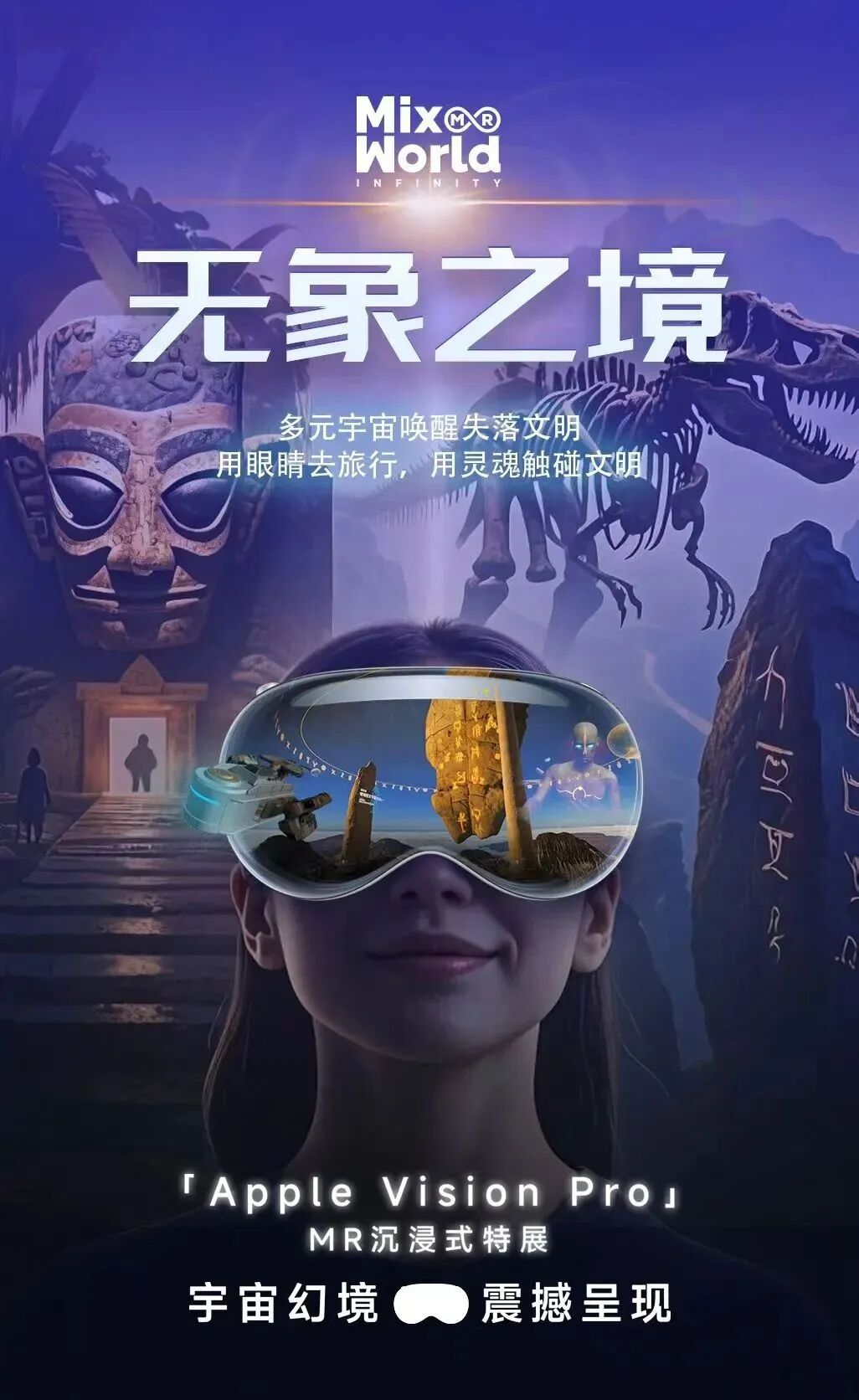 《MixWorld ·无象之境》通过Apple Vision Pro等前沿设备,打破数字与物理世界的边界。观众将穿越侏罗纪雨林、探秘三星堆古国、漫步未来星际,在真实空间中与虚拟元素实时互动。这不是观看,而是置身于流动的叙事场,每一次抬手、转身都将触发新的剧情。作品以"科技平权"为理念,让尖端技术成为大众可感的情感载体,重新定义数字时代的戏剧性体验。