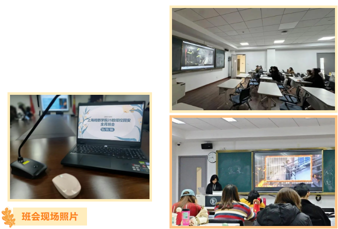 各班级均以真实案例为切入点,通过播放 “小火亡人” 专题片、剖析高校安全事故典型案例,直观展现用电不当、明火使用、诈骗陷阱等风险的严重危害。25级艺术管理研究生班结合专业特性,重点讨论了剧场布景易燃材料存放、工作室设备用电安全等场景化隐患;23级艺术管理本科班则聚焦楼道吸烟、应急通道堆物等身边常见问题,让同学们深刻认识到 “安全无小事,防患于未然” 的重要性。